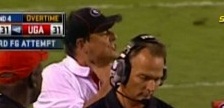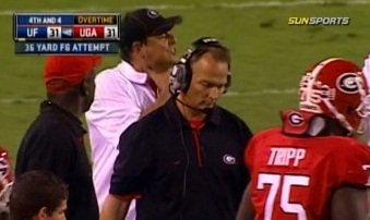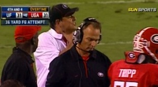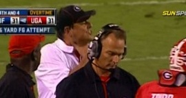 What exactly is wrong with his hair, by the way? Never thought I would say this, but dude needs to comb-overWait, what's that dude back there doing? Isn't that Grantham?Is his throat sore? Is it an alignment signal? Is he teasing Rainey about his girlfriend?Oh. My. God. He's taunting the Florida kicker. Unbelievable