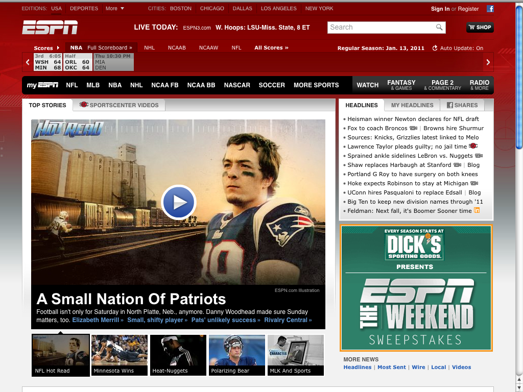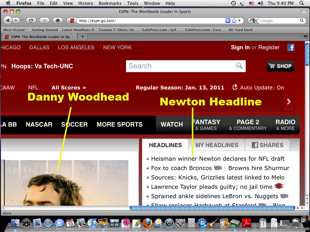 “I fully expected the Heisman Trophy winner and quarterback of the National Champion football team to command more real estate on ESPN.com when he announced his intentions,” Newton said. “Obviously I was unaware ESPN would give prime position to a feel-good NFL story about some Division III wingback.” (Newton was referring to New England running back Danny Woodhead.)