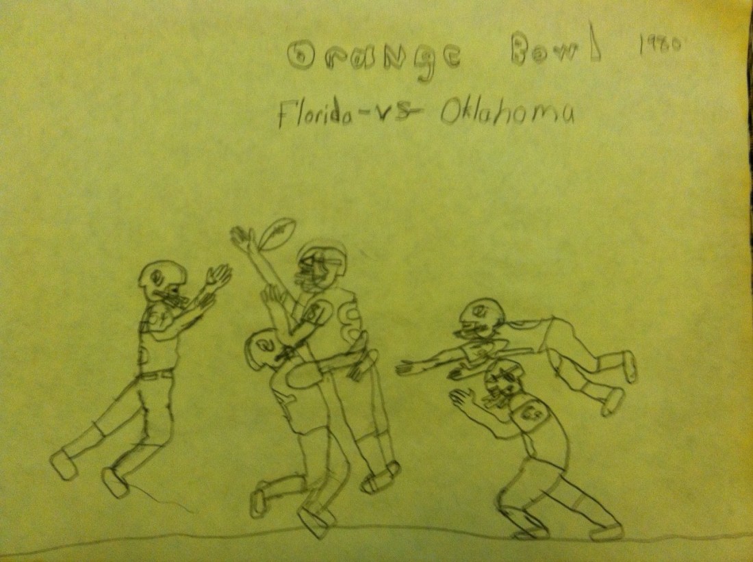 I wondered through our family’s den with a sketch pad tucked under my arm and several pencils in my hand. Not sure where I was going, but I was probably looking for a quiet spot to draw pictures of myself driving life-sized versions of my matchbox cars, which was a favorite pastime of mine in those days. Regardless, my dad called me over and explained to me that the football game on television was called the Orange Bowl and that I should watch it.