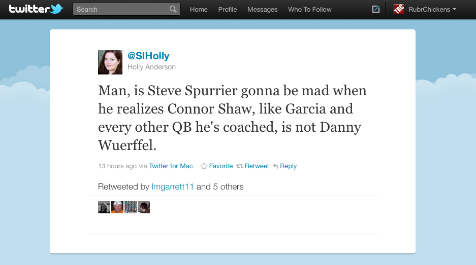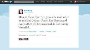 There was speculation all over Twitter last night that maybe this is Spurrier’s final jab at Garcia over his “transgressions” (for which he has been forgiven, right?) But Spurrier says no, Shaw has just played better in practice and deserves the start.