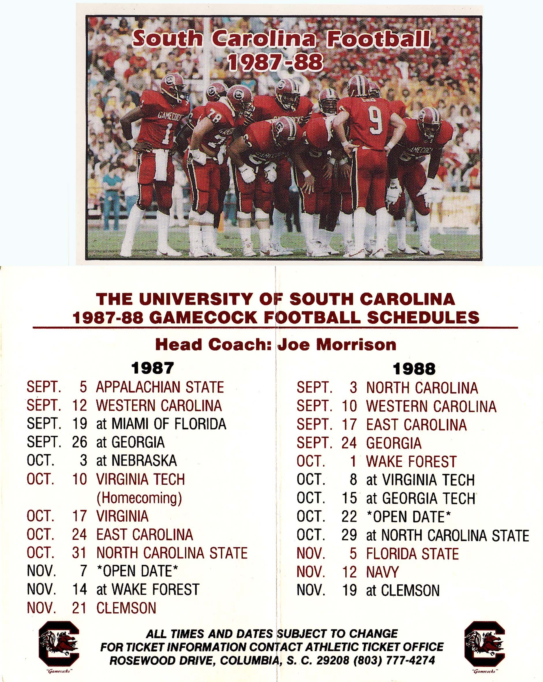 Well, I was anxiously awaiting my 1987-88 University of South Carolina pocket schedule. That’s right, college football was so stable back in those days we could print TWO years at one time without fear of Miami of Florida jumping to the Big 8 Conference or North Carolina backing out on their home and home obligation.