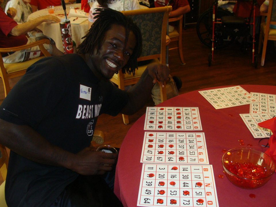 No, those aren’t multiple bingo cards that Victor is playing (and apparently winning, with a straight left-to-right bingo on the second row of the top card). No, instead this is the latest development in parimutuel betting: bingo-disquised parley cards. What he is actually celebrating is his wise removal of the marker from the 70 box on the “O” line of the middle card. For the uninitiated, the “O” line is for the Orange Bowl, and 70 was Hampton’s bet on the number of points one of the participants would surrender. Seasoned gambler, obviously.