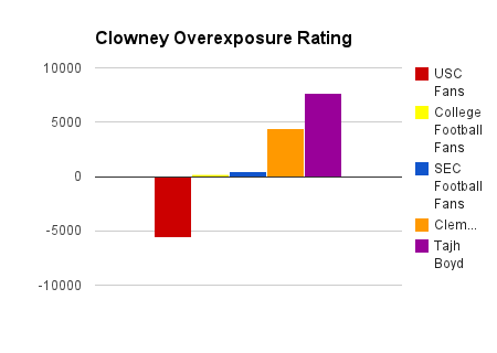 In yellow is college football fans in general. This number would probably be below the Clowneyline if not for Michigan fans. I think college football fans across America love J.D. and his exploits for the most part. But the Michigan fans’ utter hatred for “The Hit” pushes the entire group into overexposure territory.