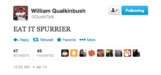 No, Spurrier went on to talk about Bruce Ellington, one of his favorite players, whom he is trying to help get a better draft position. In a sense he was actually complimenting Watkins, a consensus top-10 pick, by saying “hey, my guy had more TD catches than a bonifide superstar, you scouts should pay more attention to him.” I can guarantee you Steve Spurrier has the utmost respect for Sammy Watkins’ football skills. Lighten up, Francis.