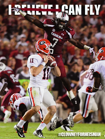 Heisman Watch. There is a player on the South Carolina football team that deserves to be invited to New York in December for the Heisman ceremony, and his name is not Marcus Lattimore. While Lattimore is arguably the best running back in the country, Jadeveon Clowney is arguably the best football player in the country. Clowney’s stat line looks rather pedestrian from last night – 4 tackles, 1 sack – but his impact on the game goes much further than that. At times he was occupying three offensive players for Georgia, creating one-on-one situations for our other linemen or blitzers. His athleticism is unparalleled for someone his size and was on full display last night.