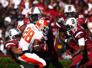 – “The Fade” game against Mississippi State. Returns a kickoff for a touchdown that is unfortunately called back by a stupid penalty. Then MSU returns a Watson fumble for a touchdown, and he completely goes in the tank (he fumbled again later, maybe even twice, if I’m not mistaken.) Then he runs out of bounds while we’re trying to run out the clock. A bad day for Watson that ended spectacularly for the Gamecocks.