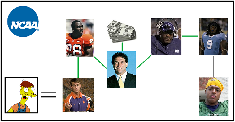In my former life as a member of the criminal justice system, I often used Relationship Diagrams to help visualize connections between people and actions. The diagrams were extremely helpful during investigations, and juries loved them. Now, I am certainly not suggesting that anything illegal is afoot with the NCAA probe into agents and college players, but part of me suspects that, somewhere in the mysterious offices of the NCAA Committee on Infractions, there is a piece of foam posterboard that looks something like this:-tbone