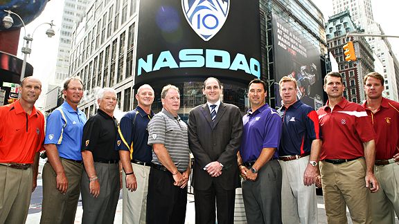 Since even bad publicity is better than the media Sahara that is PAC 10 football (home of the 1:00 am eastern kickoff), the conference decided to stage a photo opportunity in front of the NASDAQ billboard. No, there is no relation between the PAC and the DAQ, and yes we are in a recession caused, in part, by Wall Street, but Ari apparently likes the visual association of the PAC with unearned, undeserved money (he’s thinking of YOU, Kiffin). Witness: